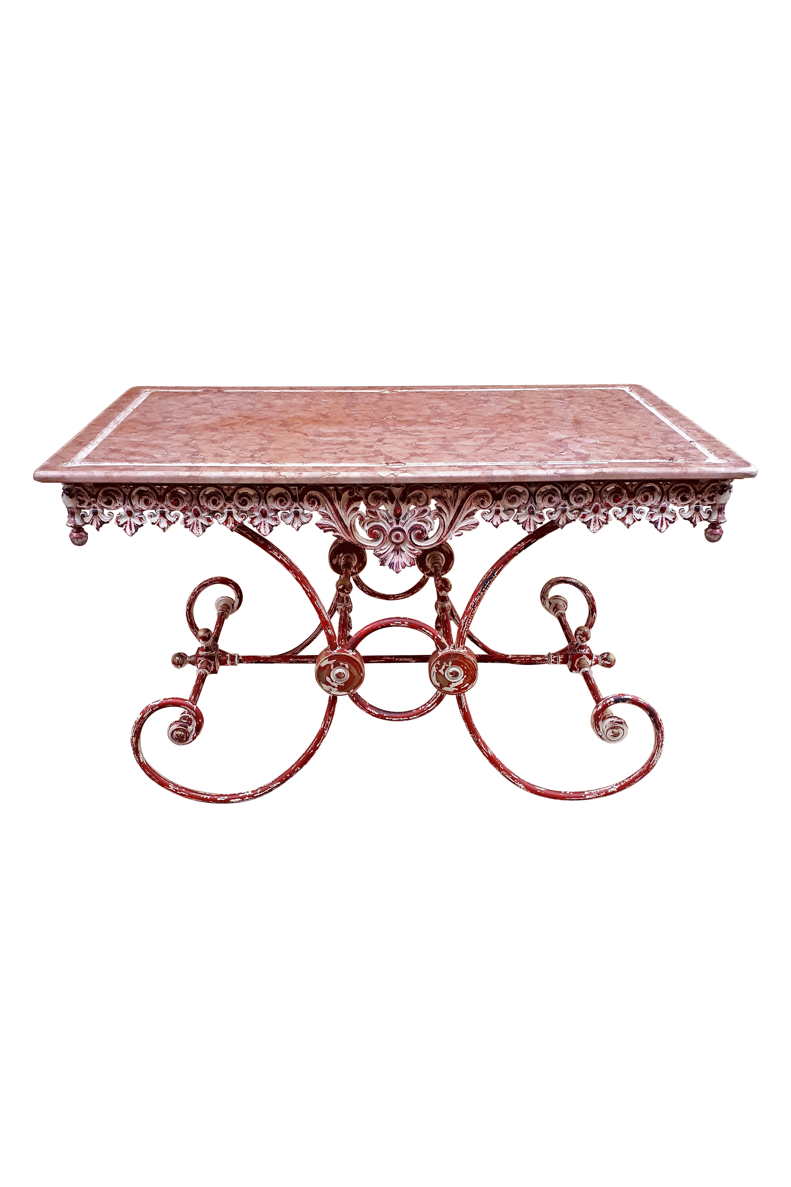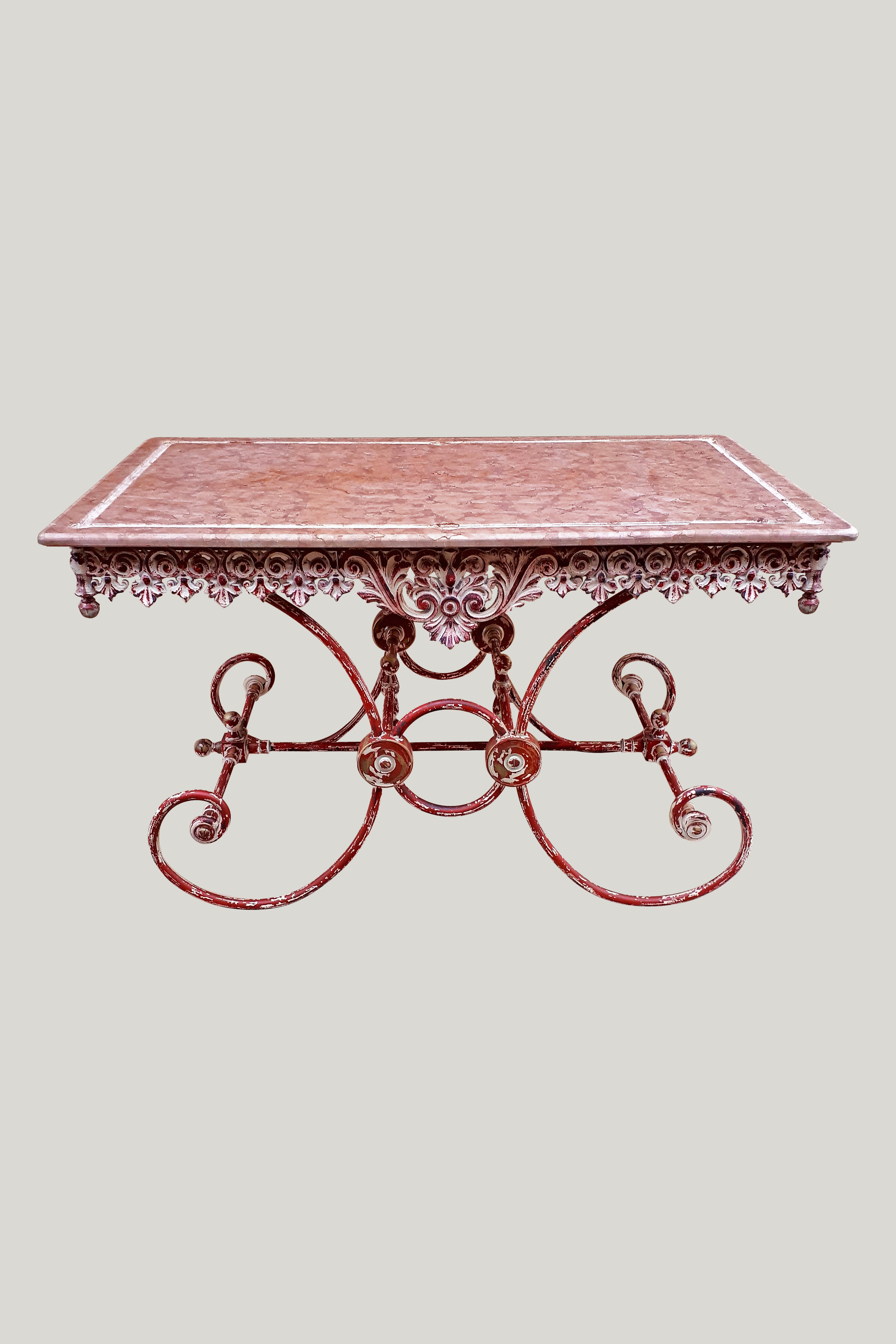 Hergestellt aus Schmiedeeisen mit Gusseisen und Messing Dekorationen, mit einem weißen Marmor-Arbeitsplatte, dieses Tisch ist ein typisches Modell des 19. Jahrhunderts der sich für die Küche oder Garten eignet und bietet Einzigartigkeit für den Raum.