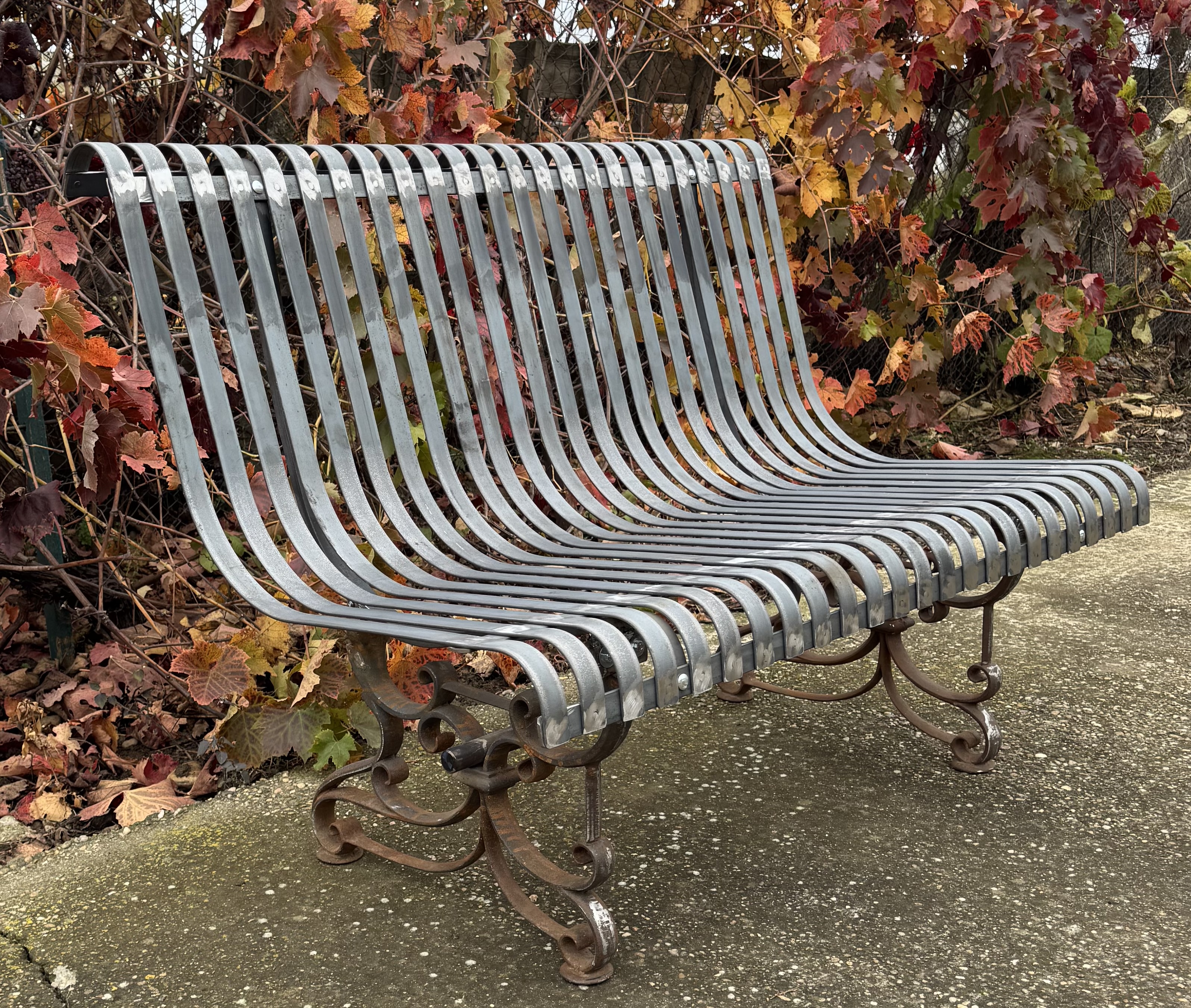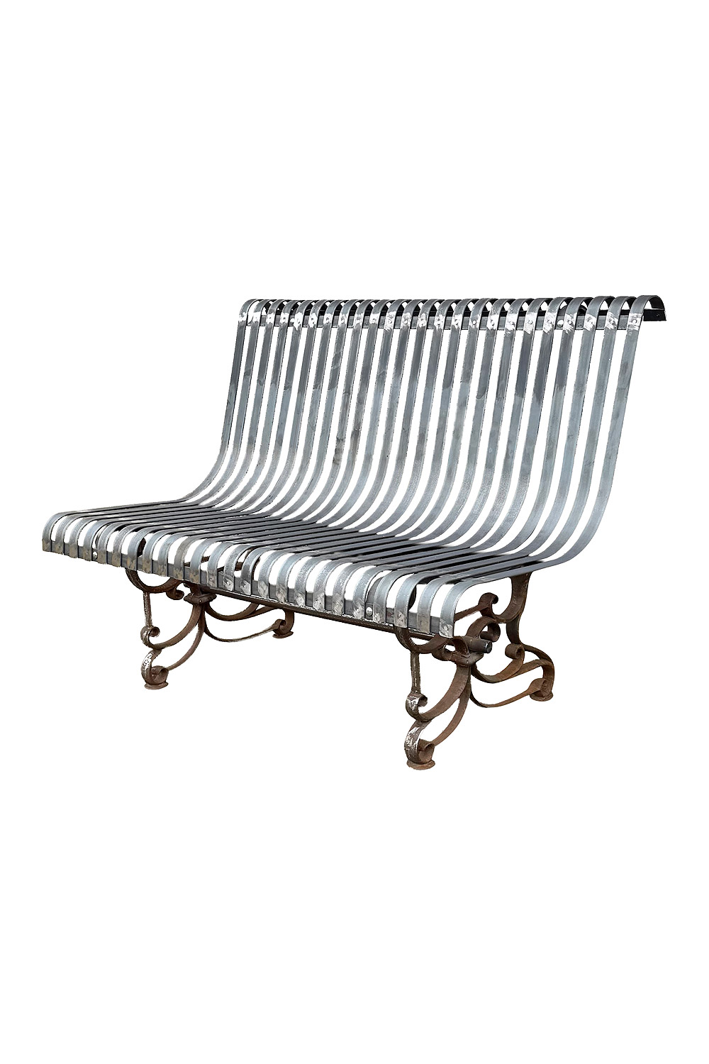 Ce magnifique et robuste banc de jardin en métal de style ancien français était à l'origine un banc de gare. Son élégant motif en volutes lui confère un charme vintage indéniable.