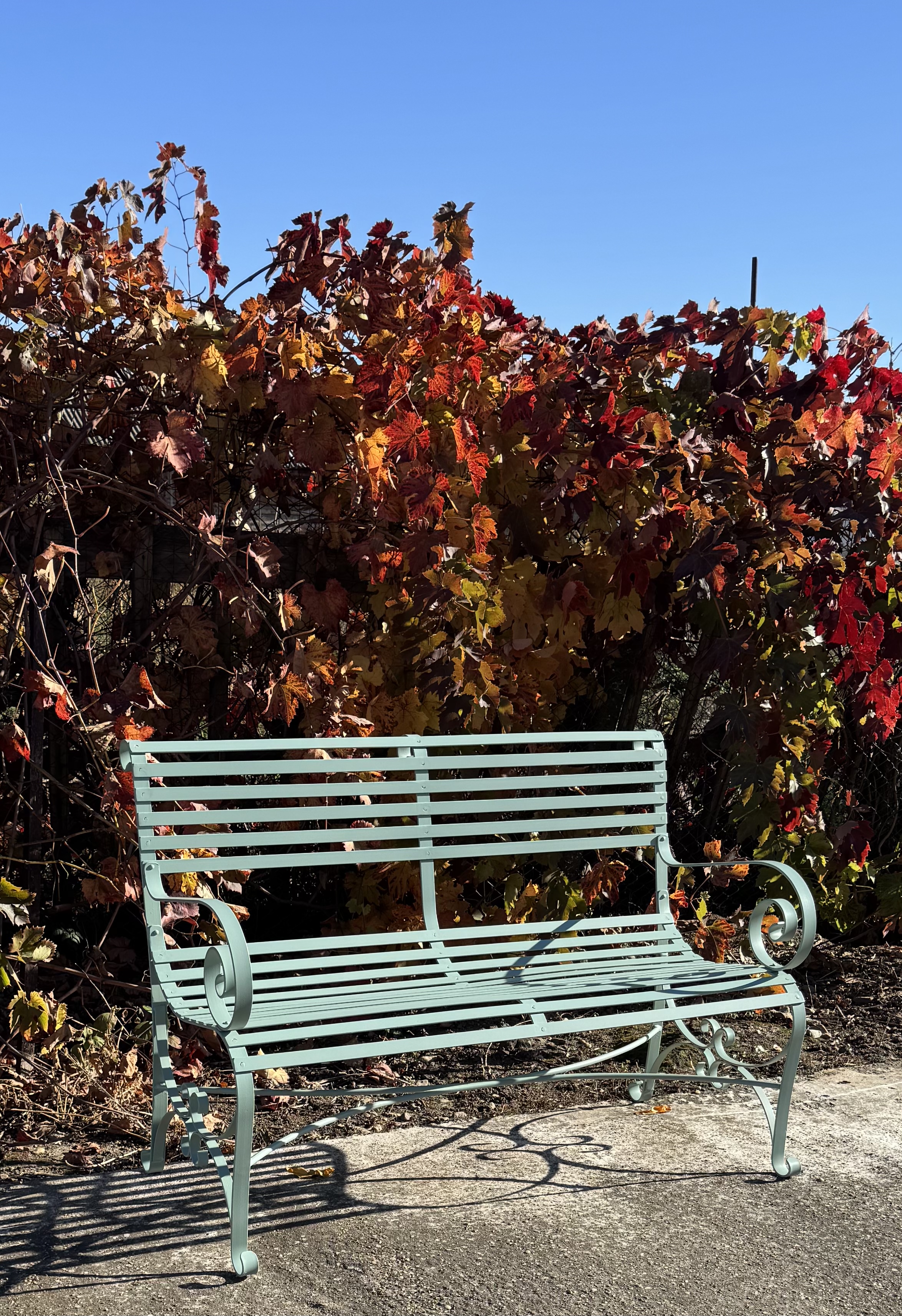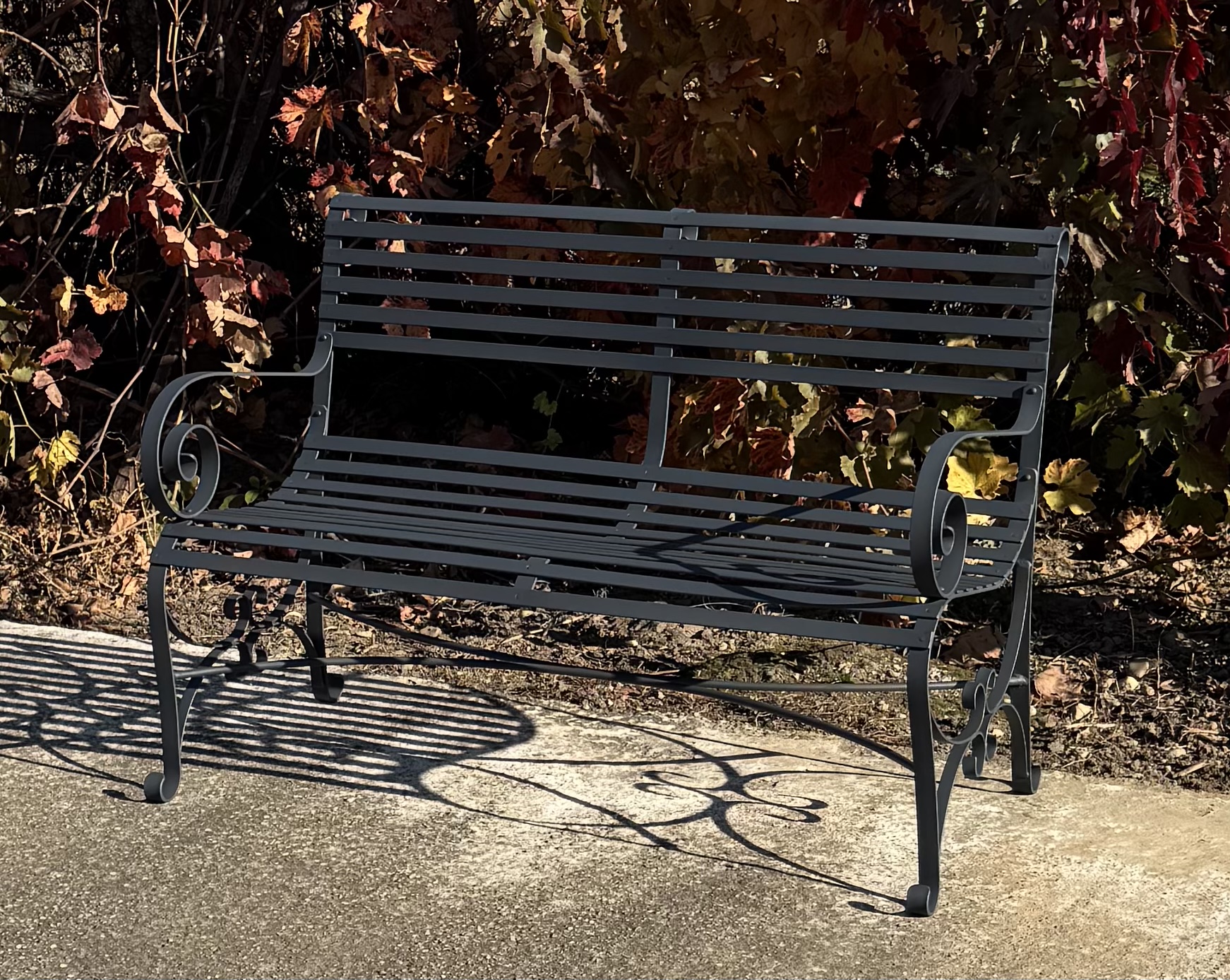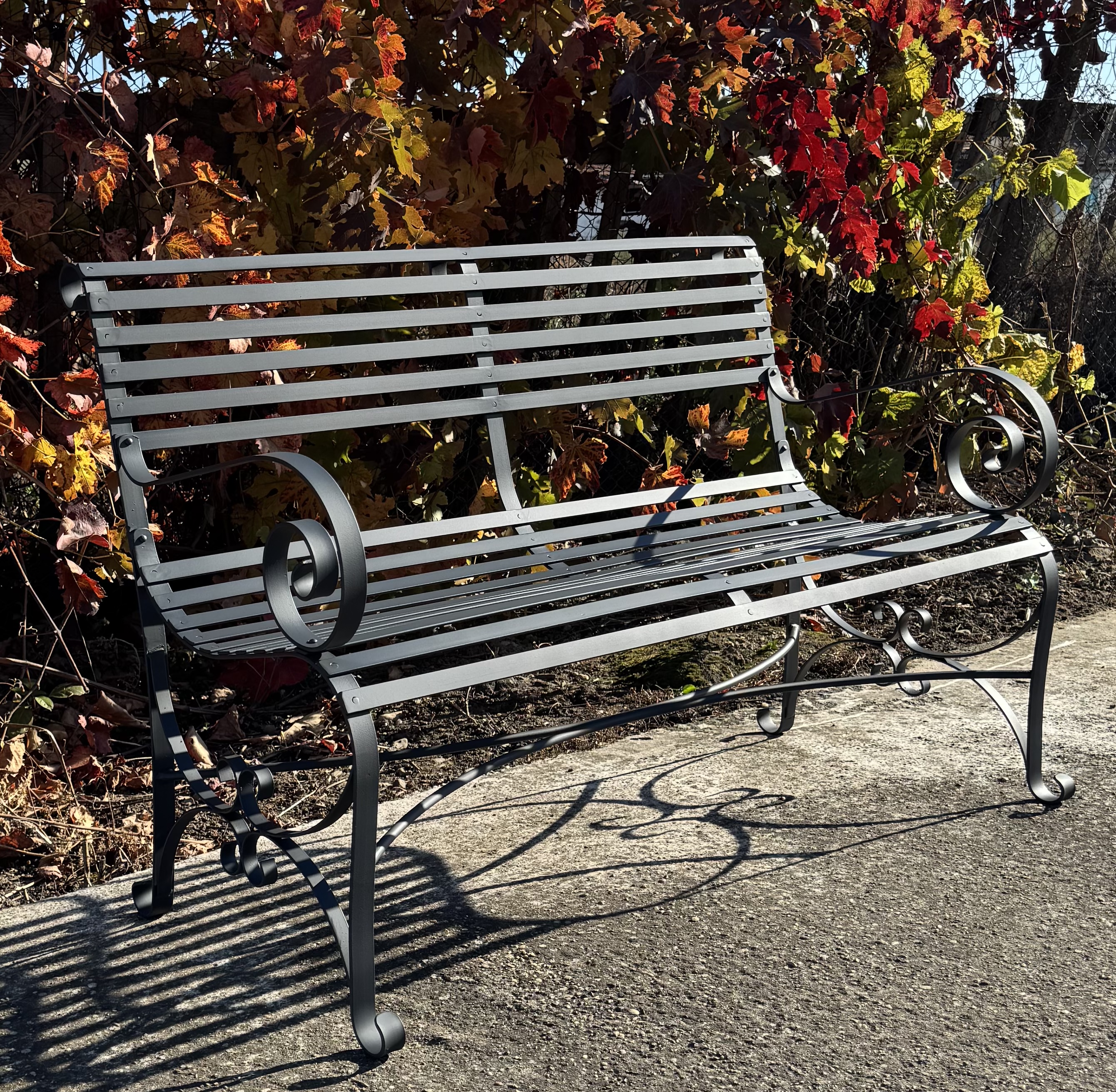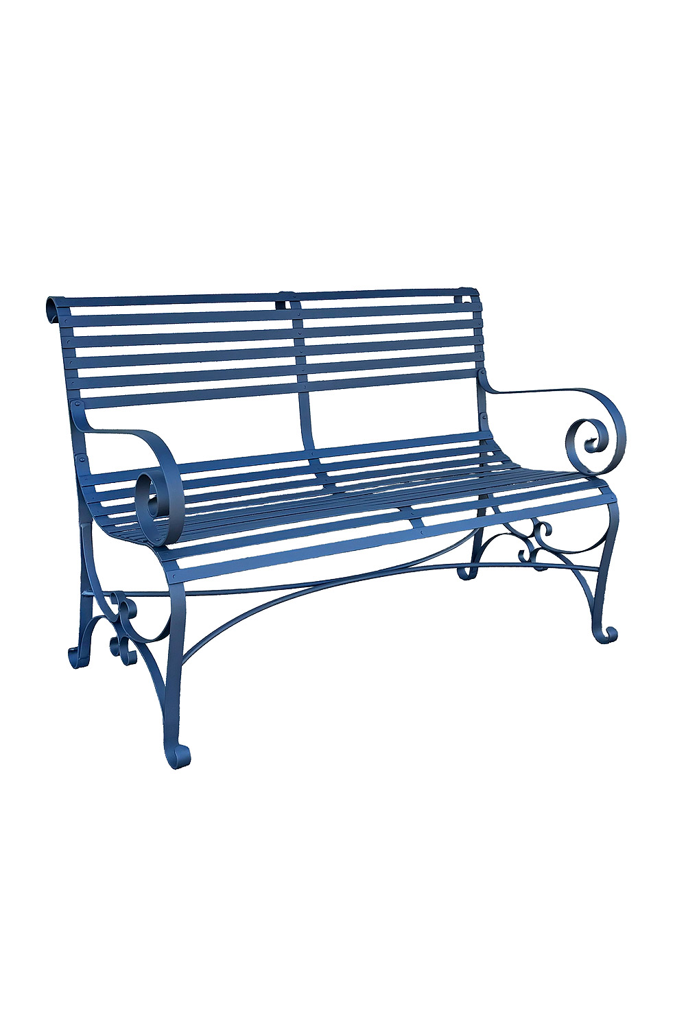 The armrests and legs are decorated with graceful culed scrolls and rounded fet, giving the bench a classic, elegant look with a light, airy feel despite its stury metal construction.