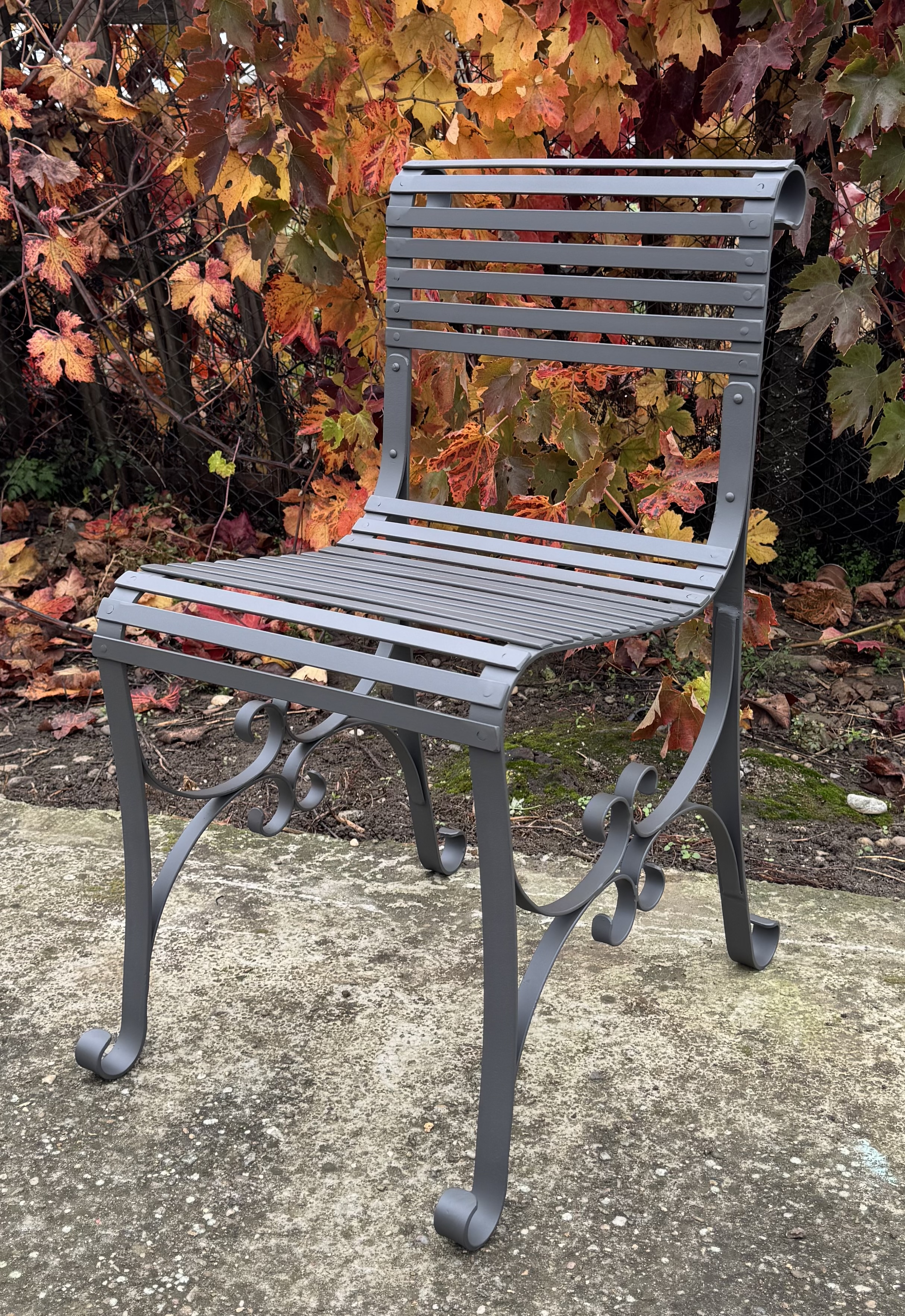 The chair is decorated with graceful culed scrolls and rounded fet, giving the chair a classic, elegant look with a light, airy feel despite its stury metal construction.